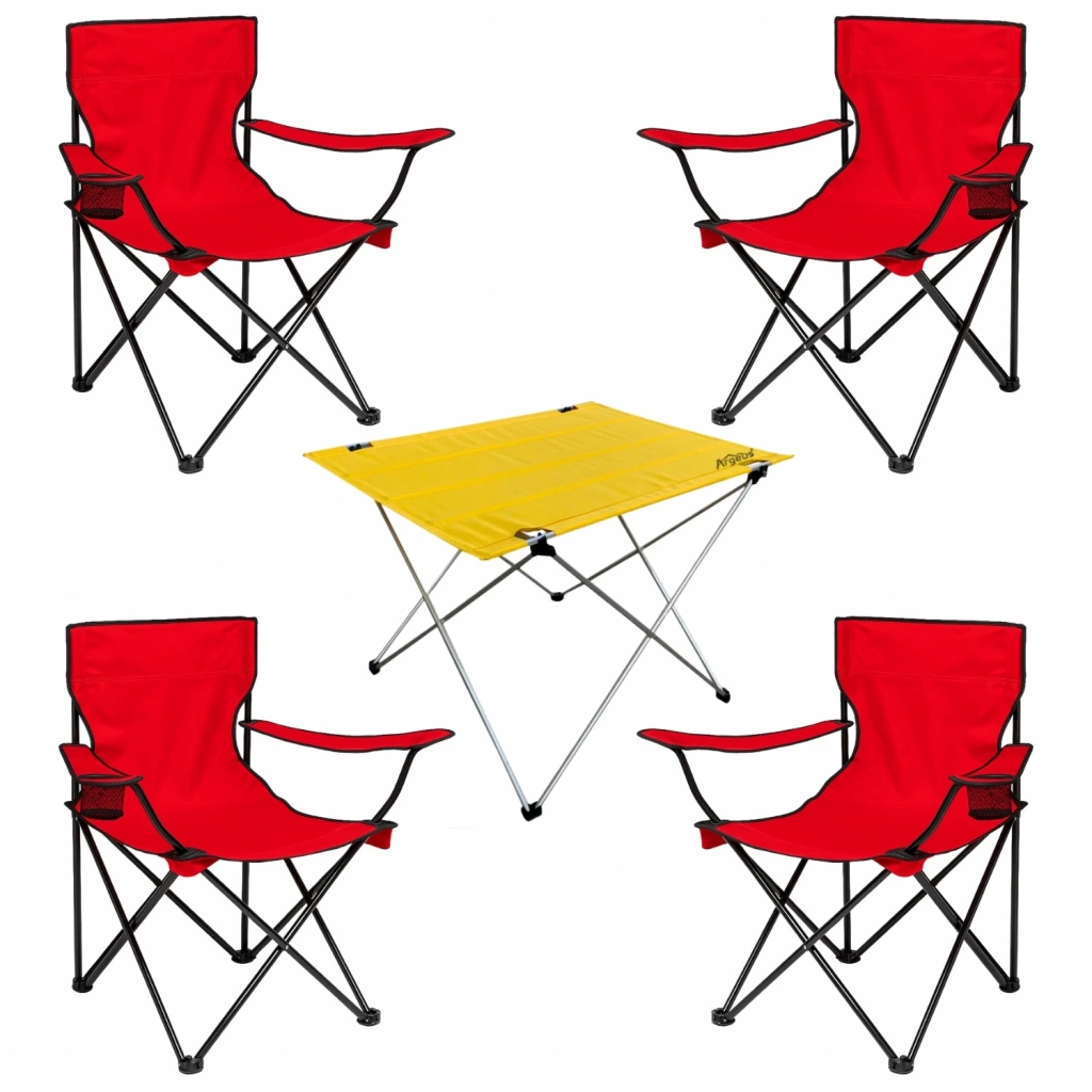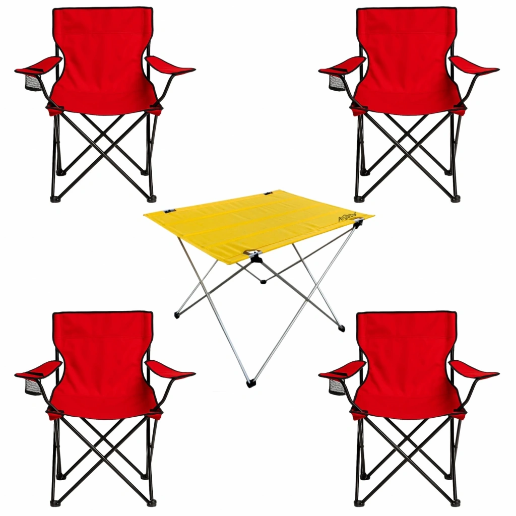 4 Adet Katlanır Kamp Sandalyesi ve Masa Seti - (DY.001) - Kırmızı/Sarı - Plaj Sandalyesi