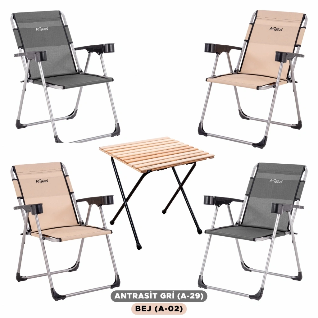 4 Adet Katlanır Kamp Sandalyesi ve Masa Seti - Rock - Bej/Antrasit - Bardaklıklı - 140 KG