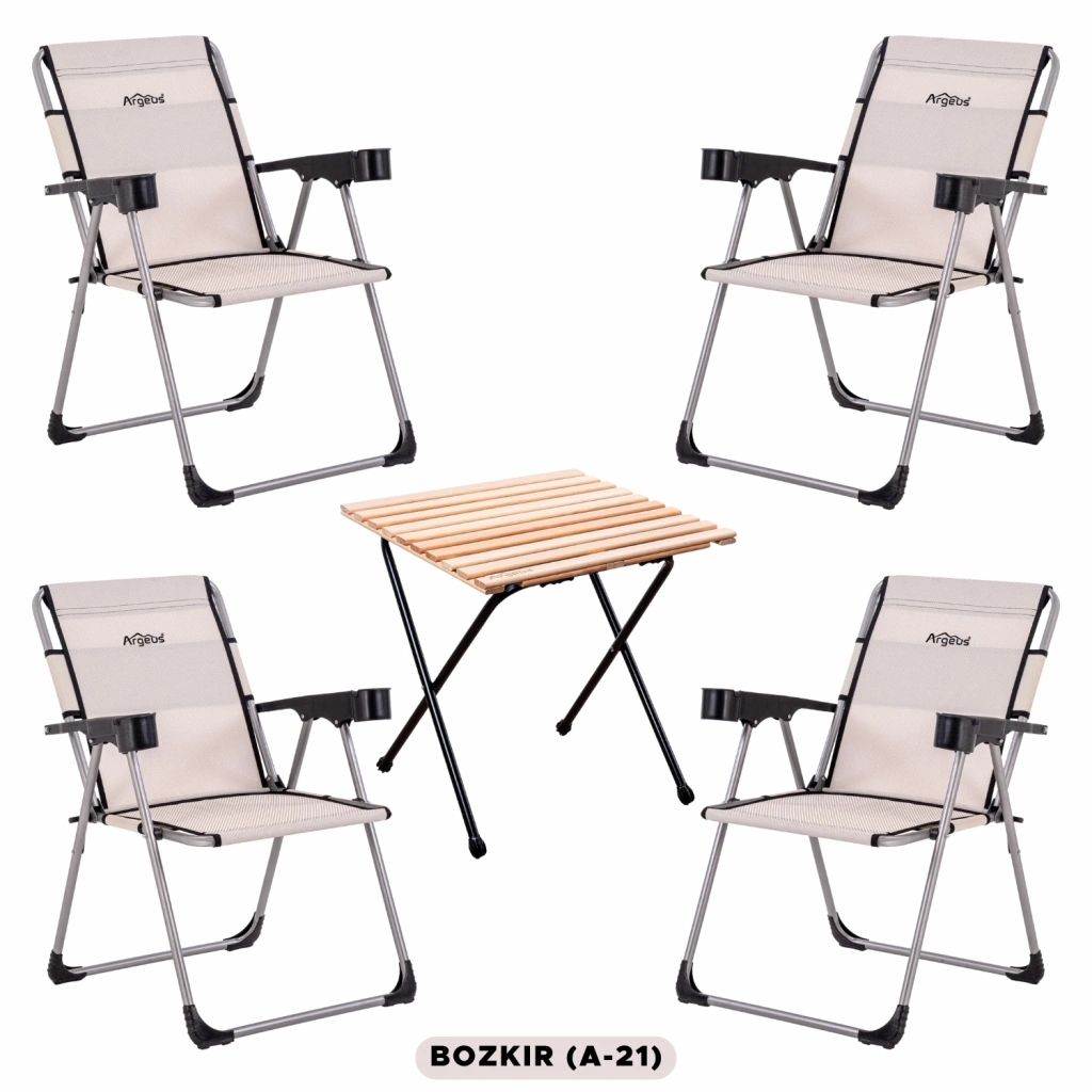4 Adet Katlanır Kamp Sandalyesi ve Masa Seti - Rock - Bozkır - Bardaklıklı - 140 KG