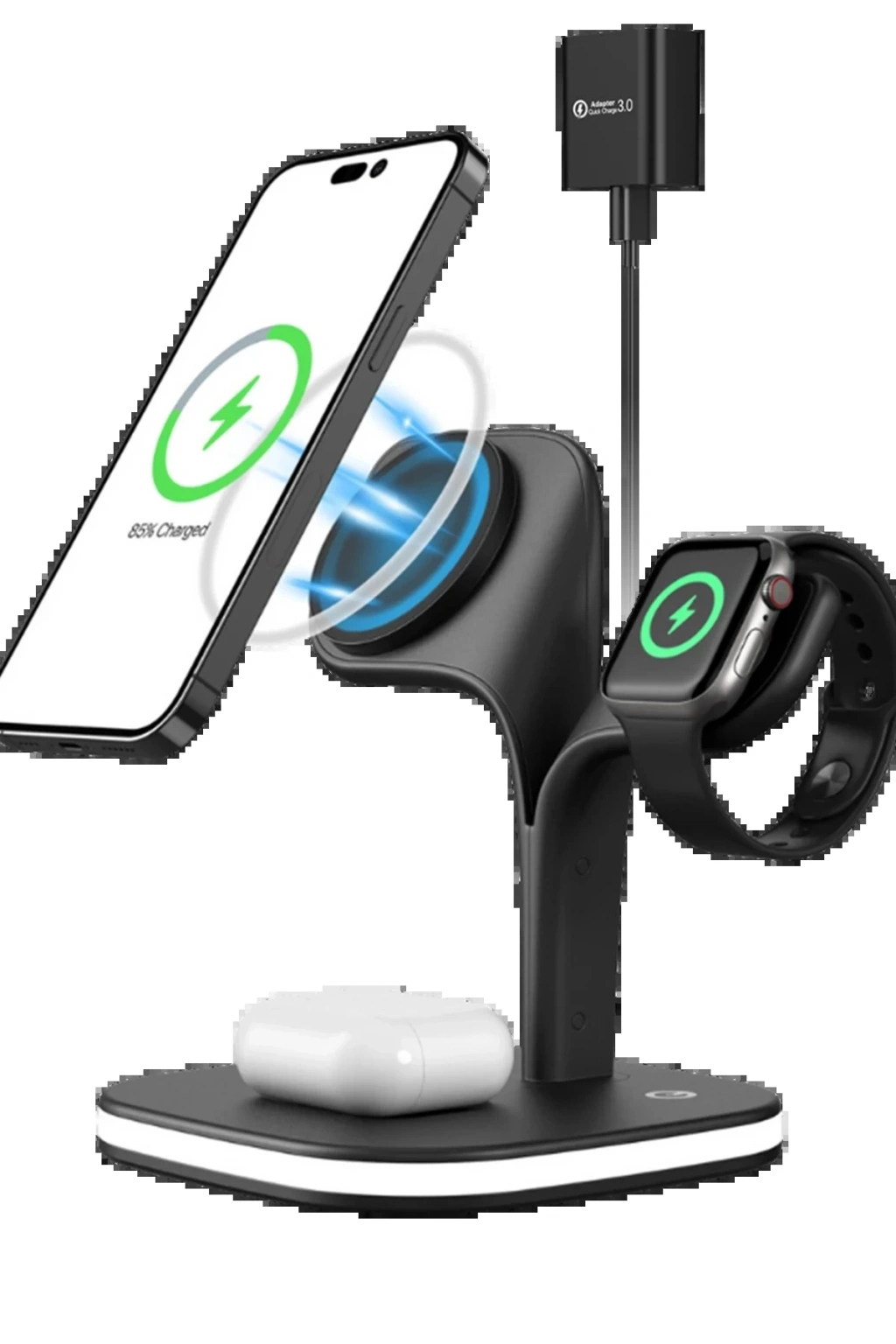 Phone, AirPods, iWatch ve ek Qi uyumlu cihazları aynı anda şarj ederek verimliliğinizi artırır.