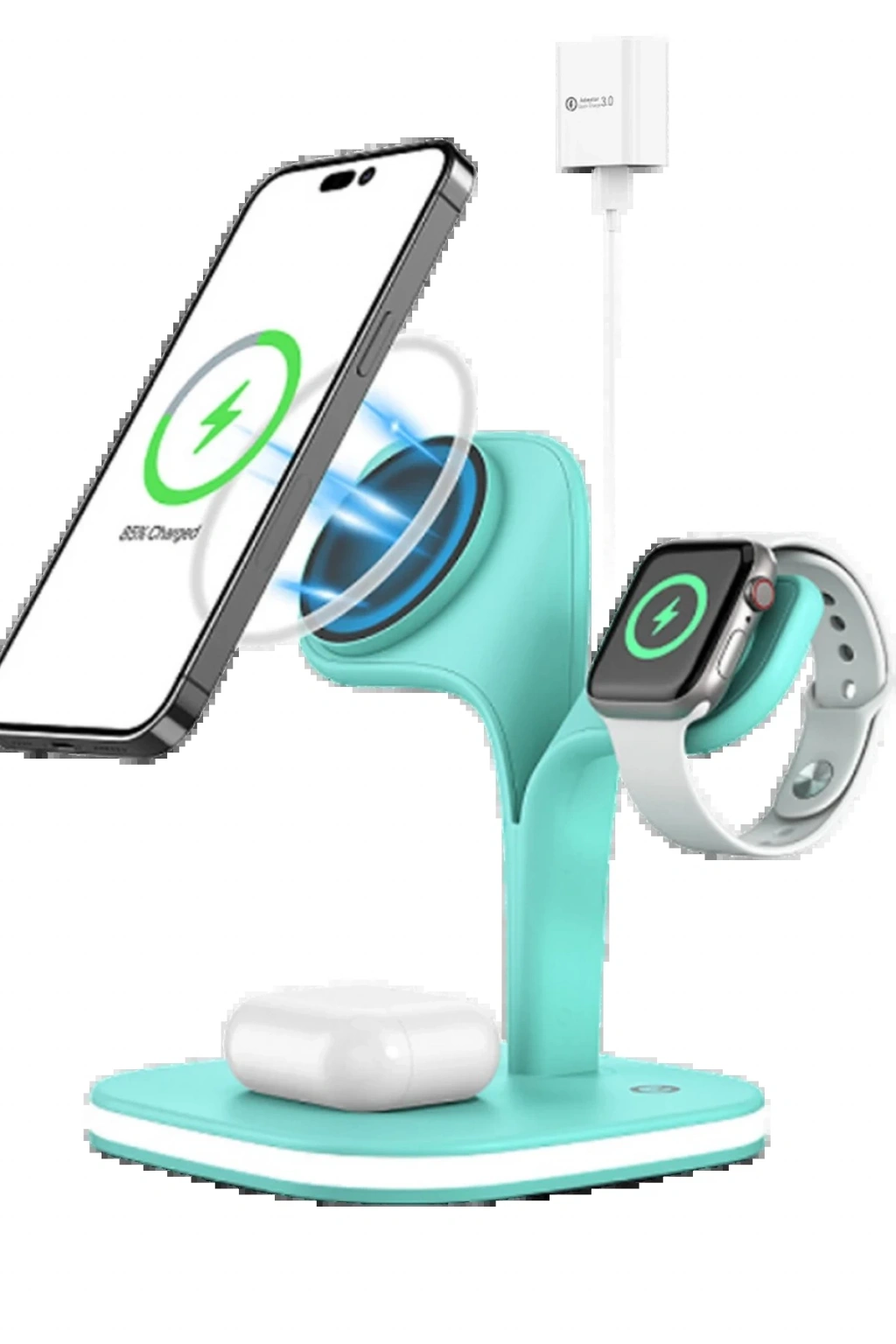 Phone, AirPods, iWatch ve ek Qi uyumlu cihazları aynı anda şarj ederek verimliliğinizi artırır.